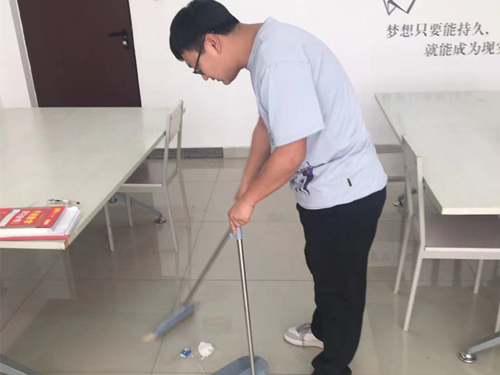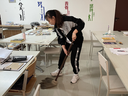 员工党员吕萍萍、韩凯利用休息时间,打扫8号、7号楼的考研自习室,他们把桌椅摆放整齐,书籍放置原位,让原本脏乱的自习室变得明亮整洁,也令人心旷神怡。员工党员聂唐薇将校园内被风吹倒的垃圾箱整理归位,保持校园环境整洁有序。