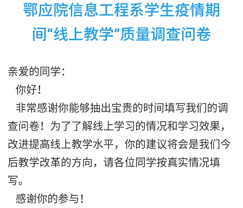 5月22日至5月23日,信息工程系对全系线上教学运行情况进行问卷调查,进一步了解和掌握教师线上教学运行和员工学习效果,积极改进线上教学工作。调查对象为参与线上教学的非毕业班全体员工,共发放线上调查问卷1692份。问卷主要就员工线上学习工具与学习平台、主要线上学习困难、教师线上教学过程评价、线上教学满意度评价、线上学习效果、对任课教师的教学手段和方法等内容进行调查。